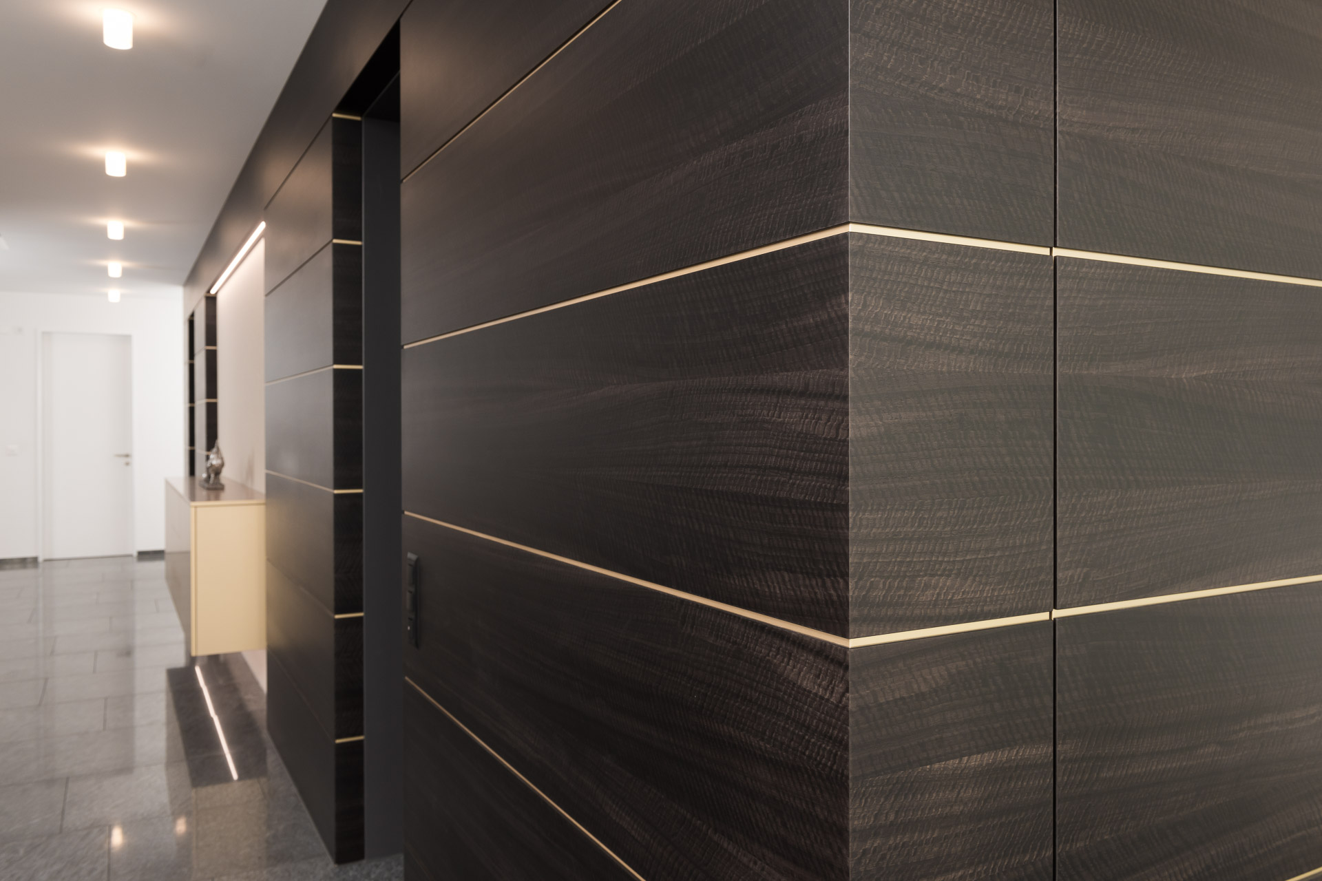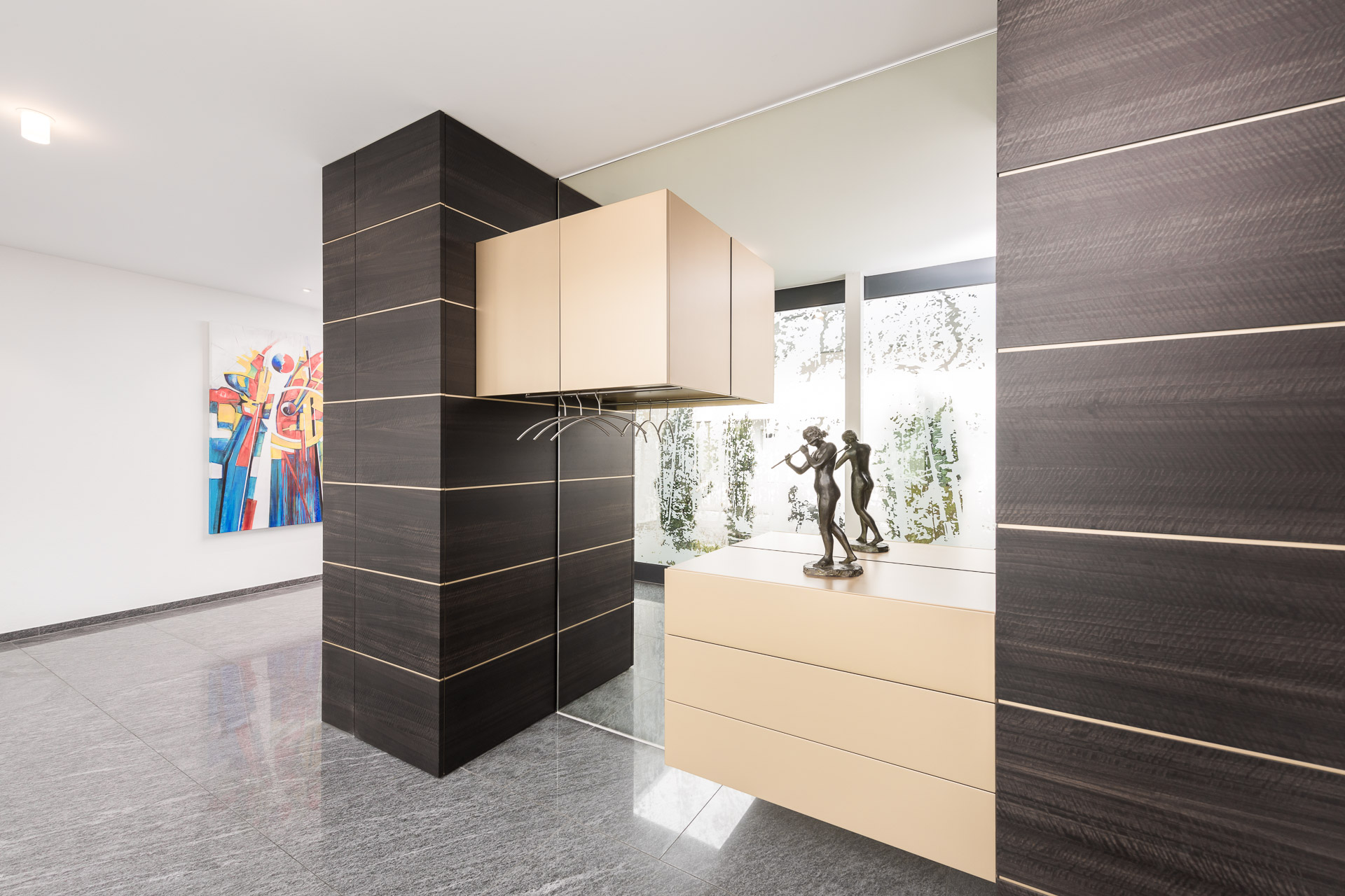 Raumgreifende Einbaumöblierung in edlem Holz und Lack als Gesamtlösung.