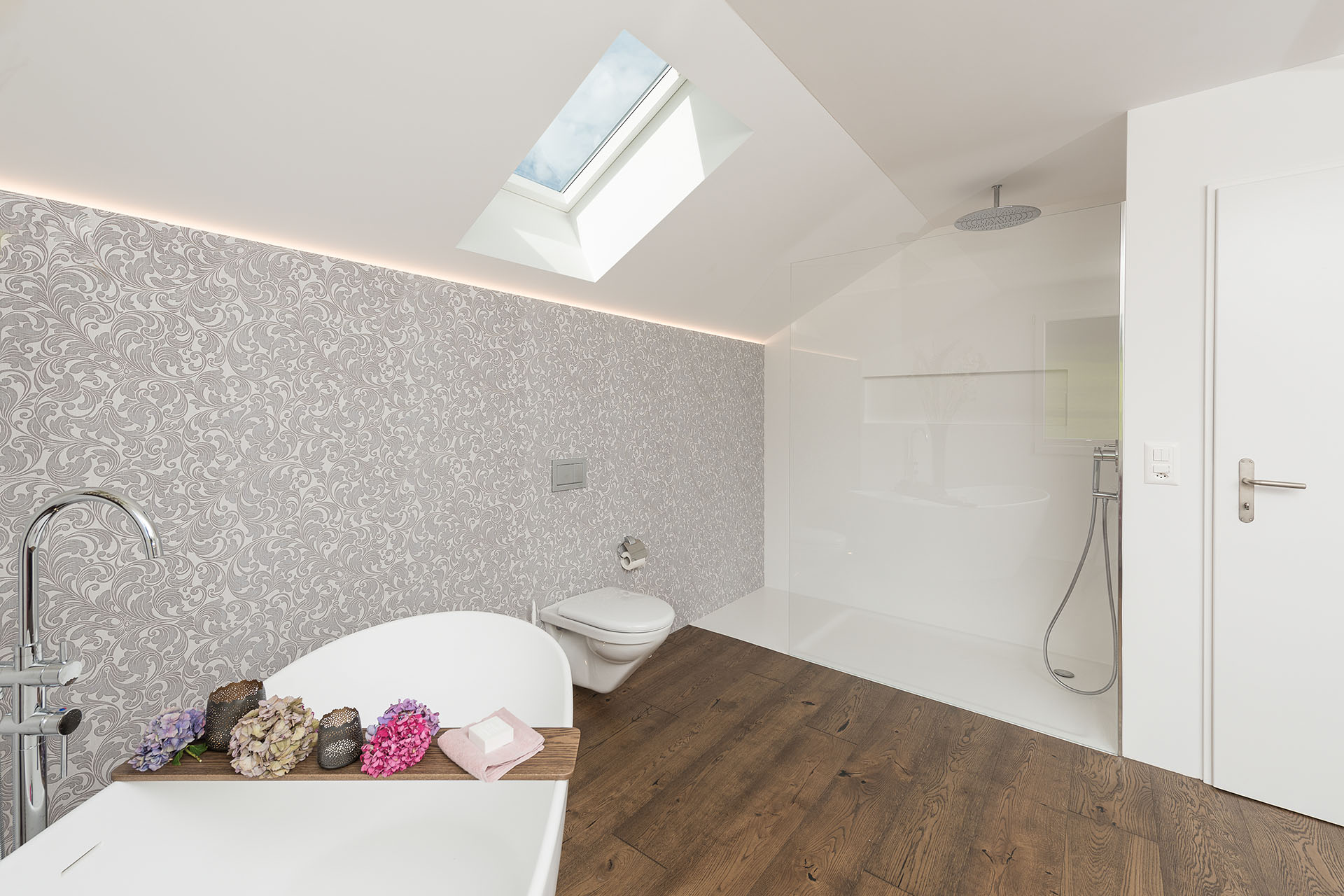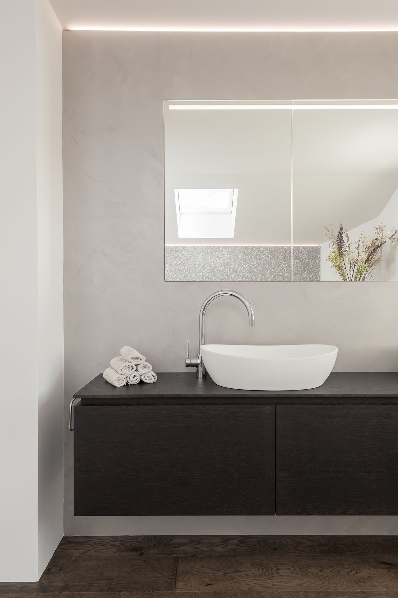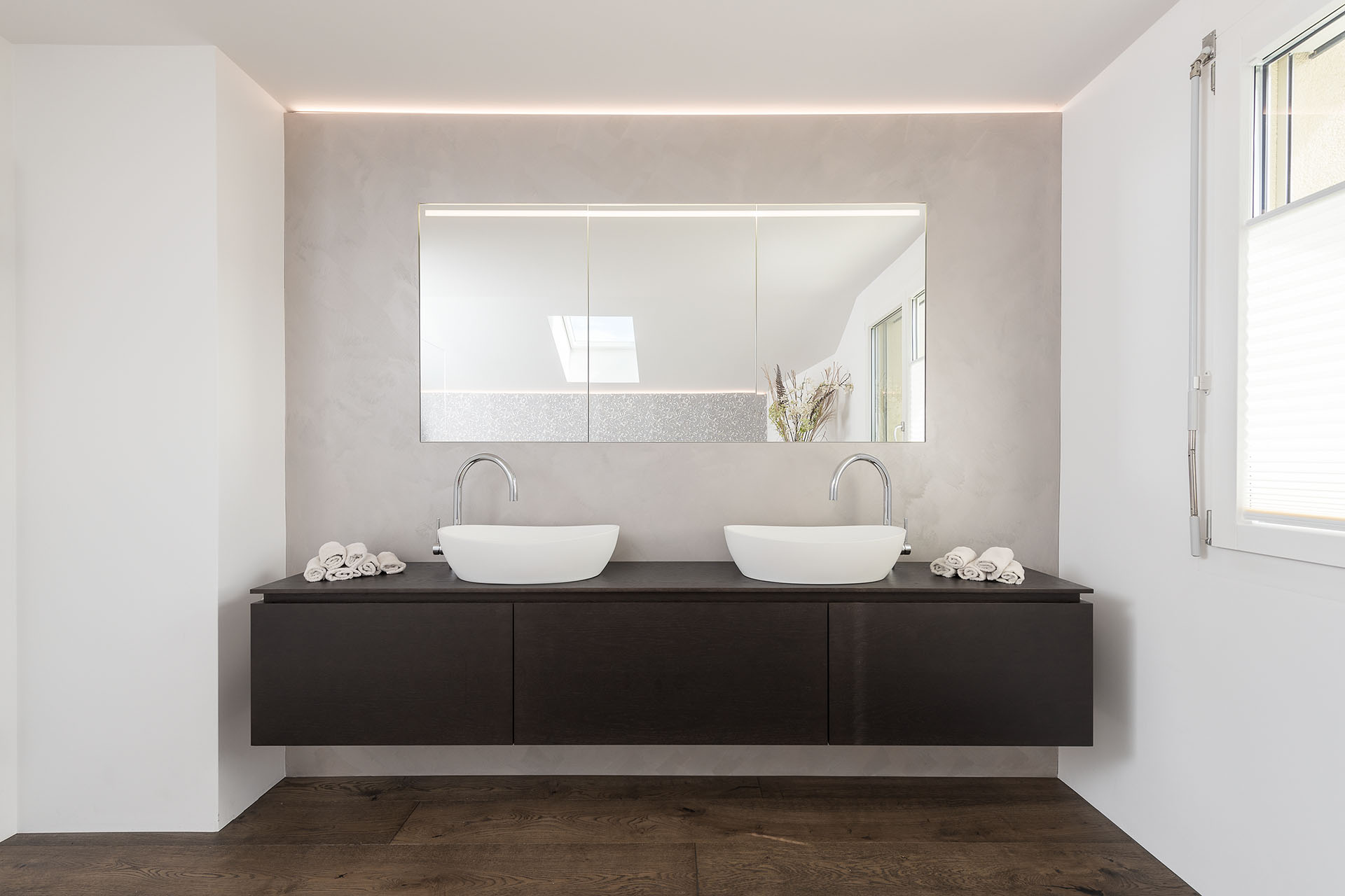 Waschtischmöbel in edlem Holz mit Aufsatzlavabos. Spiegelschrank auf Mass in Wand integriert. Dusche in Hi-Macs Acrylstein im Detail perfekt gelöst.