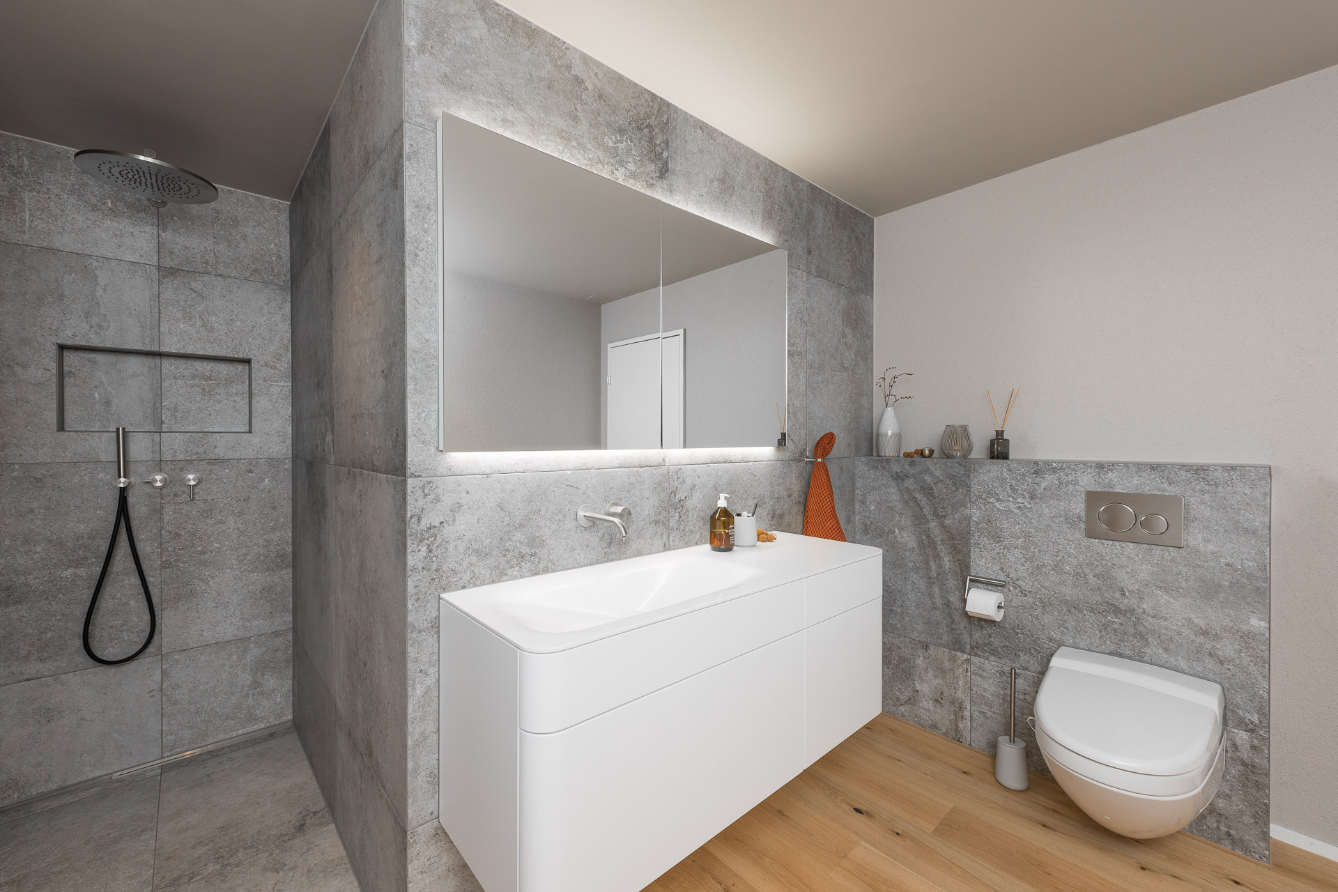 Monolithisches Badzimmermöbel in thermisch verformtem Hi-Macs Acrylstein. Spiegelschrank mit indirekter Beleuchtung in Wand integriert. Badewanne in Mineralguss als Akzent.