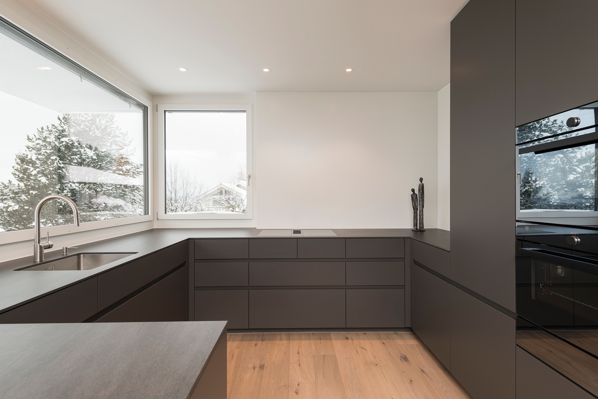 Die Keramikabdeckung und Küchenfronten in Lack antrazith, kombiniert mit den Holzelementen in Eiche, laden zum gemeinsamen Kochen ein.