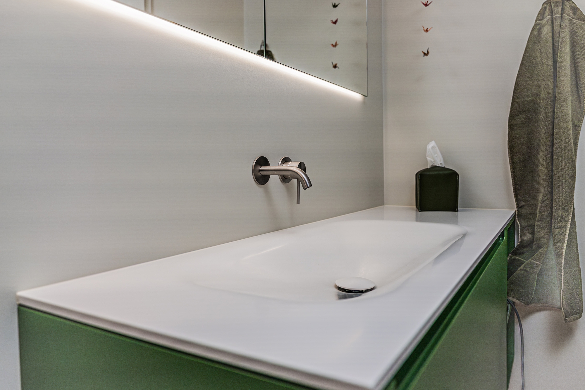 Bunttöne in den verschiedenen Materialien aufeinander abgestimmt wirken mit dem Parkettboden harmonisch. Durch den auf Mass angefertigten Waschtisch in HI-MACS können engste Platzverhältnisse optimal genutzt werden. Die Möglichkeit der individuellen Planung und Herstellung wurde auch in der Küche genutzt und umgesetzt.
