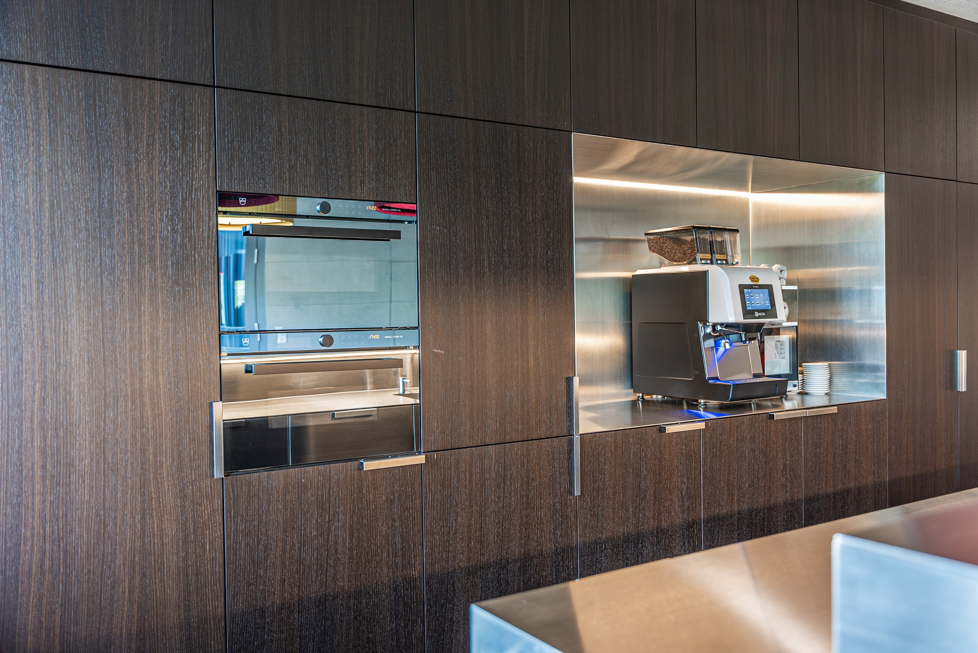 Die perfekt geplante und verarbeitete Insel in coolem Edelstahl trifft auf die elegante und warme Räuchereiche.