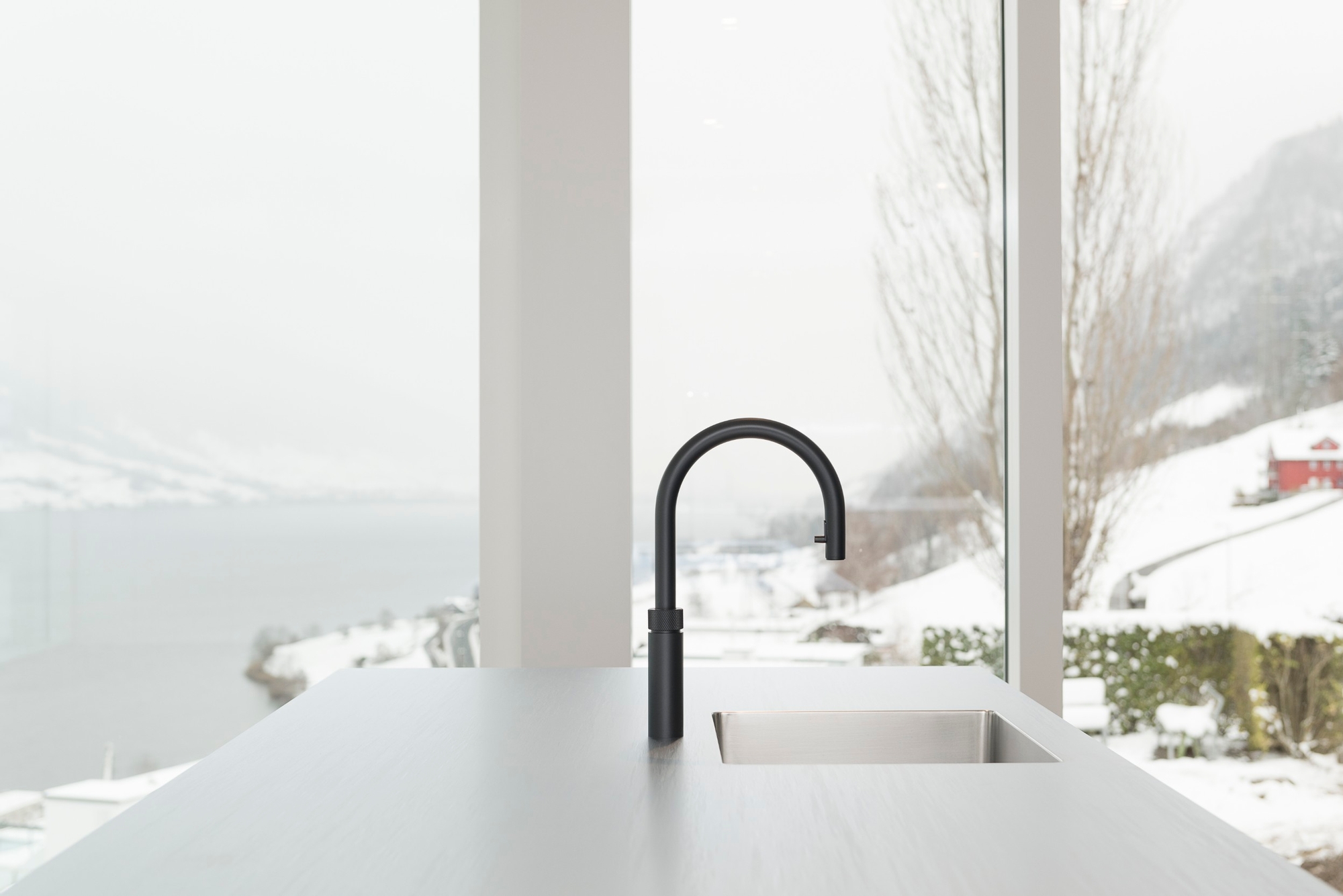 Die Küche mit Chromstahlabdeckung und schwarzem Strukturlack ergibt in Kombination mit dem Nussbaumparkett ein warmes Wohnambiente.