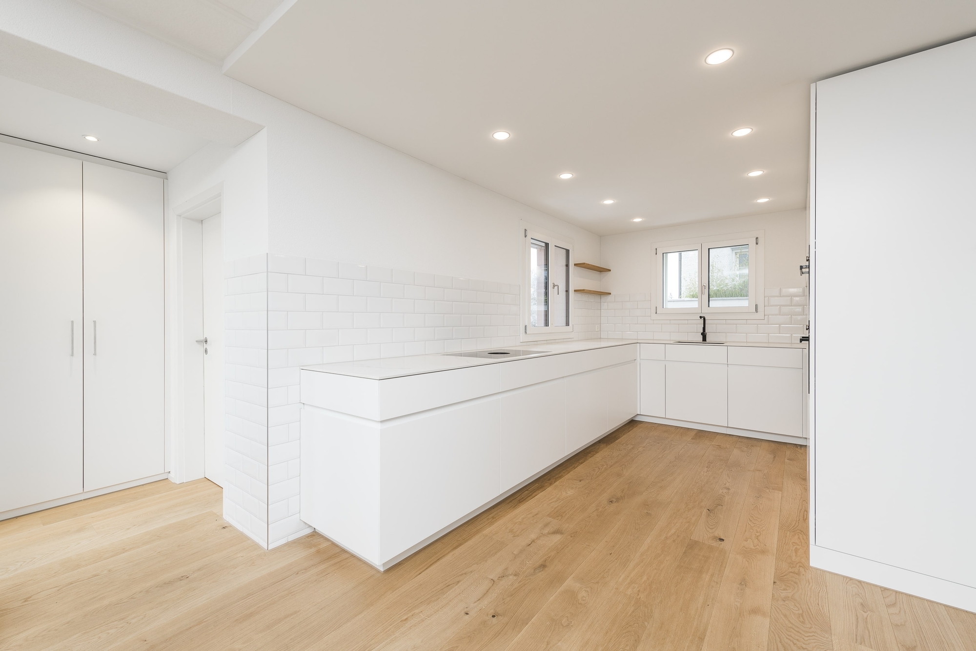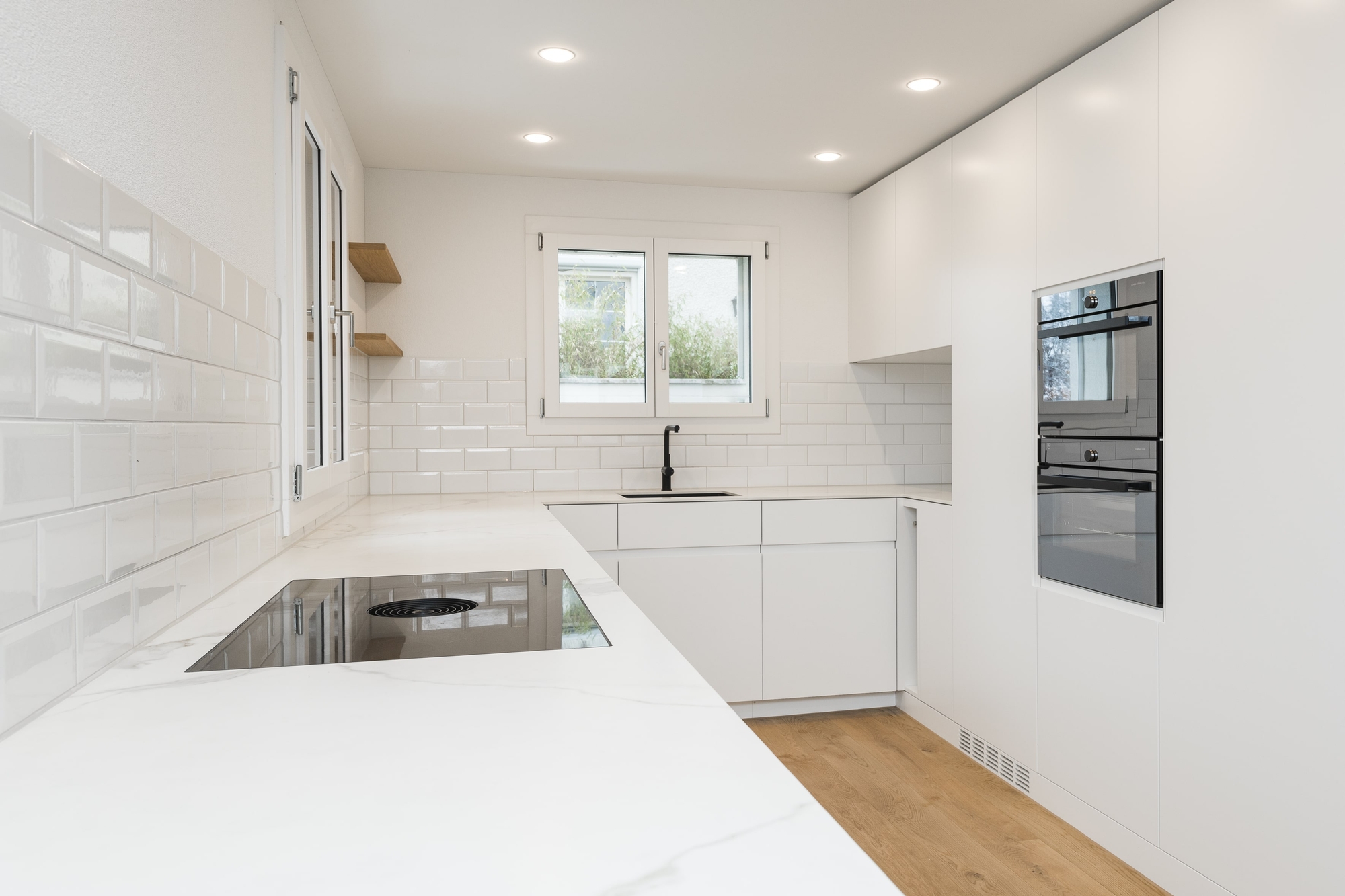 Zur Küche mit weisser Schleiflackfront wurden die keramische Arbeitsfläche und die Rückwandplatten stilgerecht kombiniert. Die Spüle und die Armatur setzen mit dem Holzboden die Akzente.