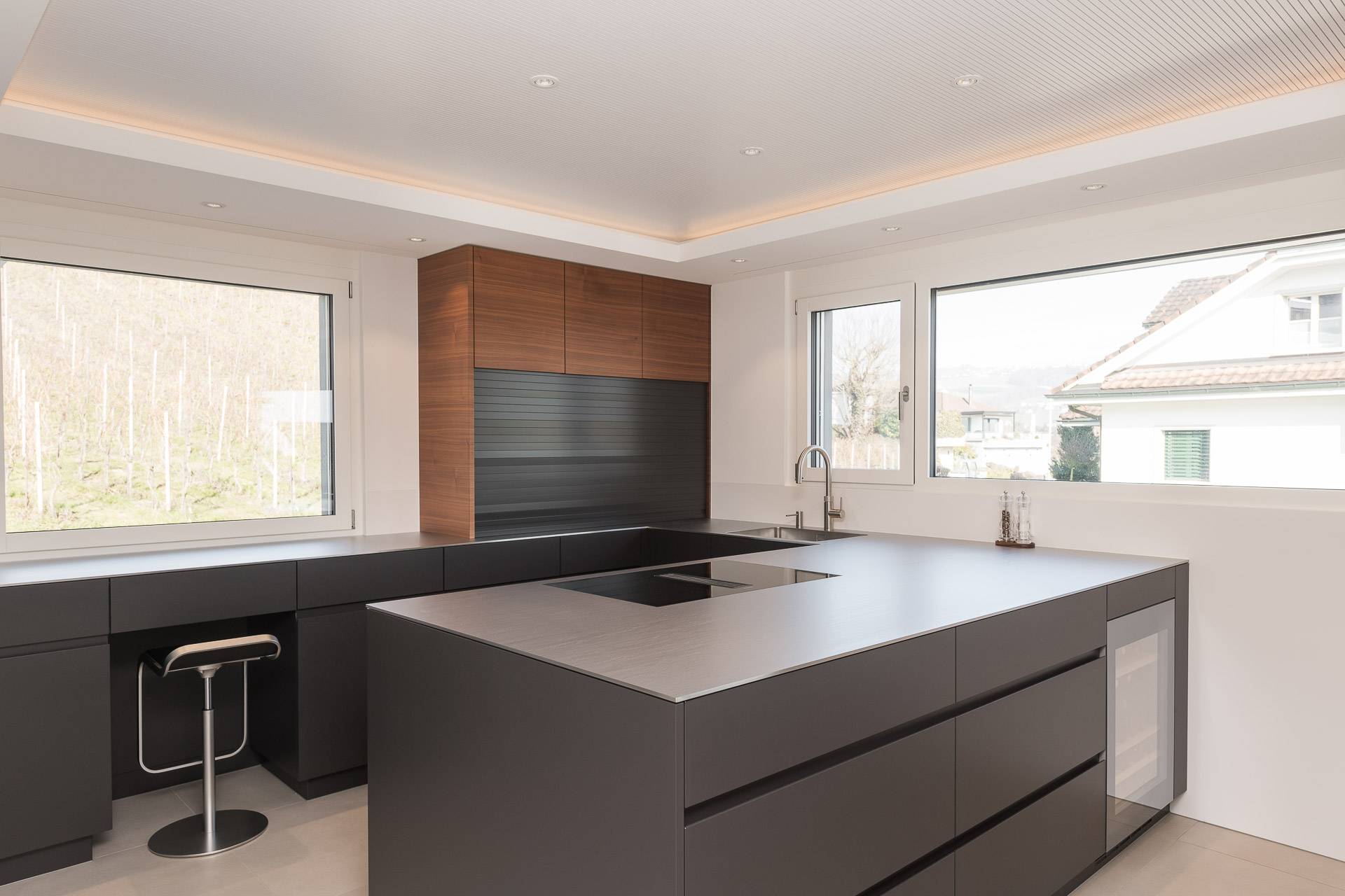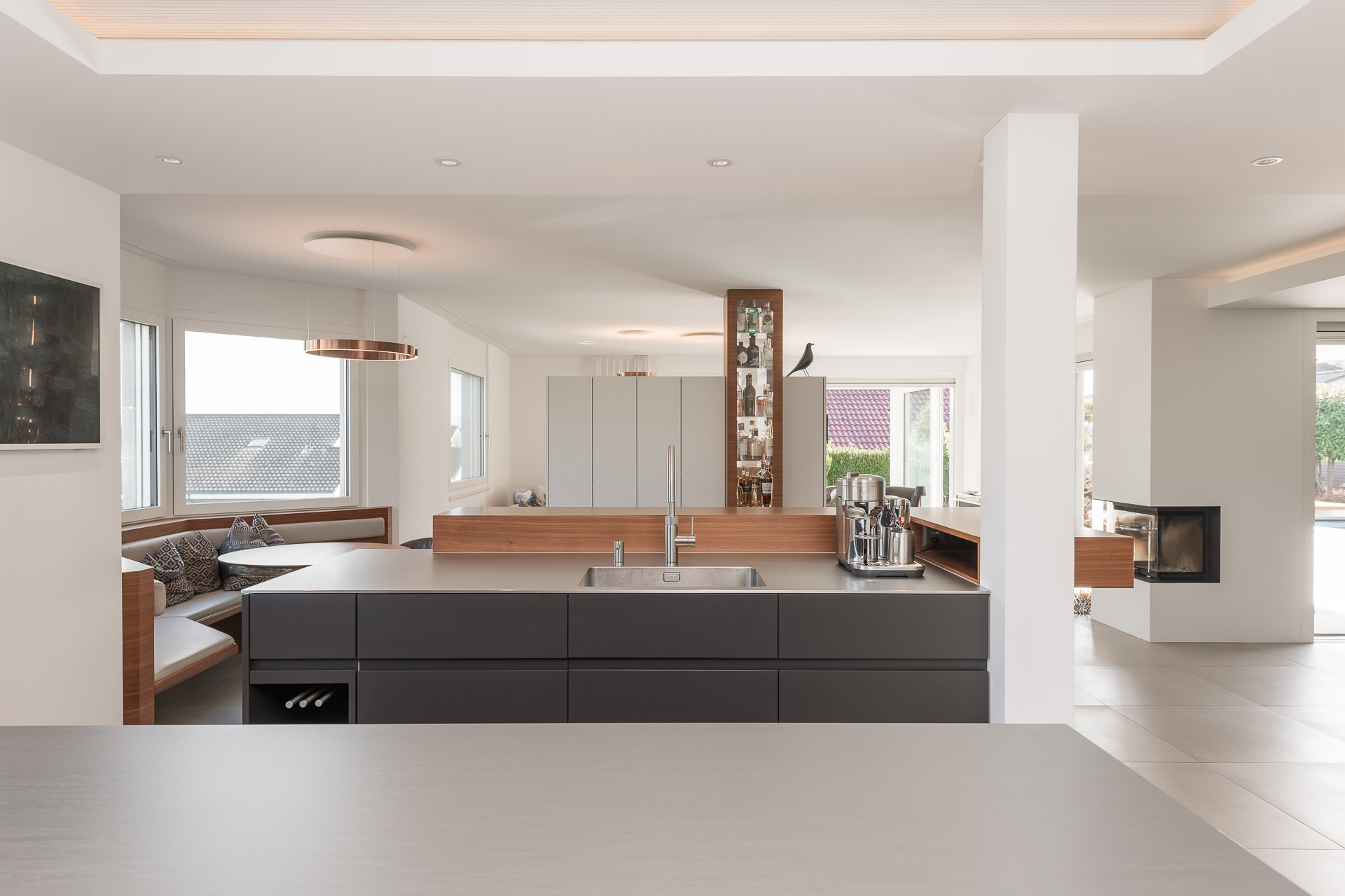 Ein weiteres Highlight ist die integrierte Akustikdecke, die für eine angenehme Geräuschkulisse sorgt und das hochwertige Wohngefühl dieser offenen Küche abrundet. Funktion und Ästhetik in perfekter Harmonie – ein Raum zum Kochen, Genießen und Leben.