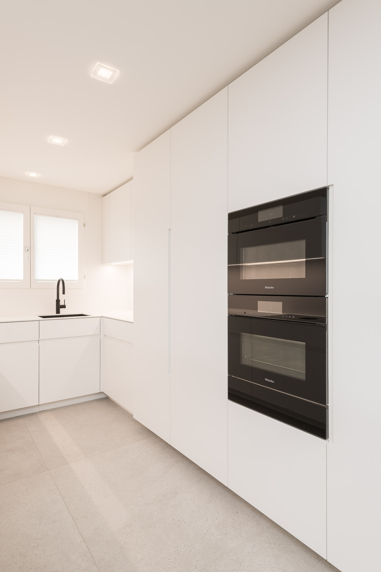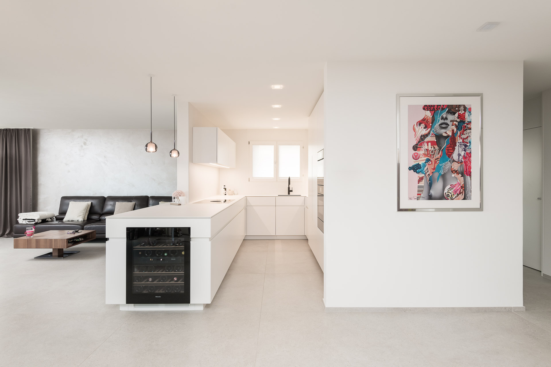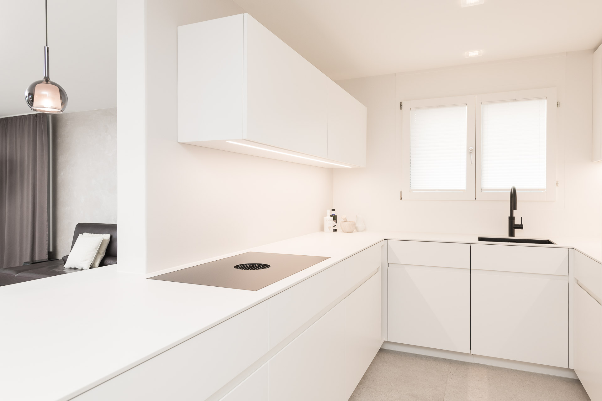 Diese Küche überzeugt durch klare Linien und ein minimalistisches Design. Die helle Keramikabdeckung verbindet Noblesse mit Alltagstauglichkeit, während die weiss lackierte Front die edle Optik vervollständigt. Schwarze Armaturen, Becken und Einbaugeräte setzen stilvolle Kontraste.
