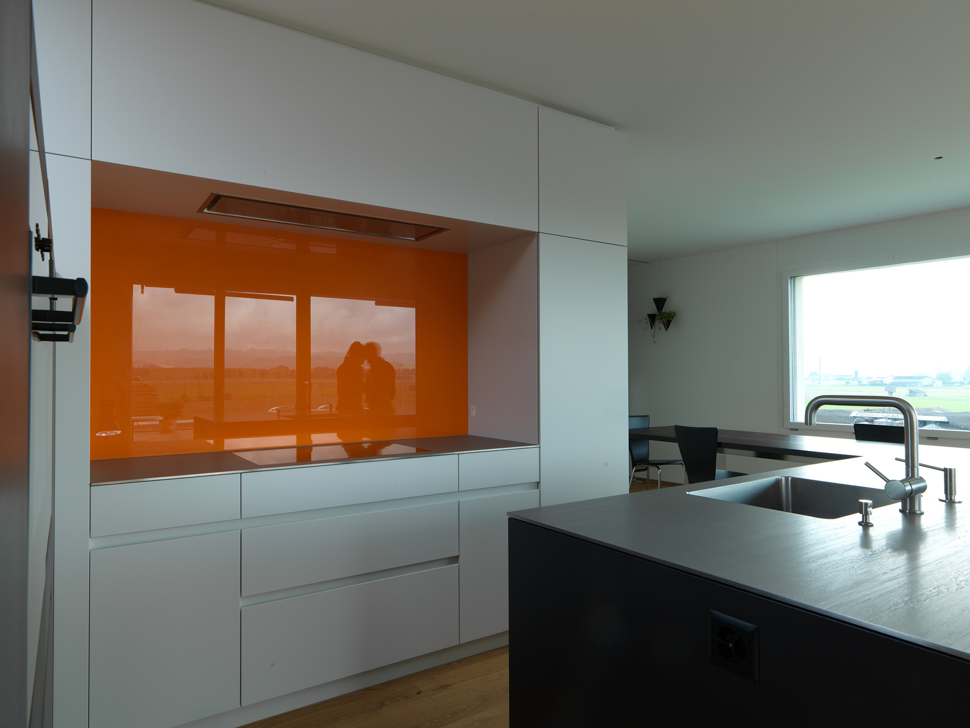 Küche als Raumskulptur in Lack, Edelstahl und Glas.